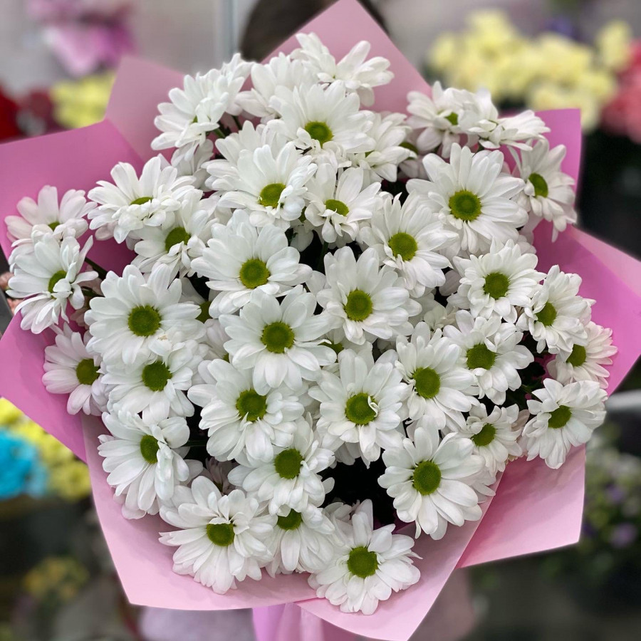 Головна / Квіти / Квіти / Хризантеми / Букет із 7 білої ромашкової хризантеми «Світанок»