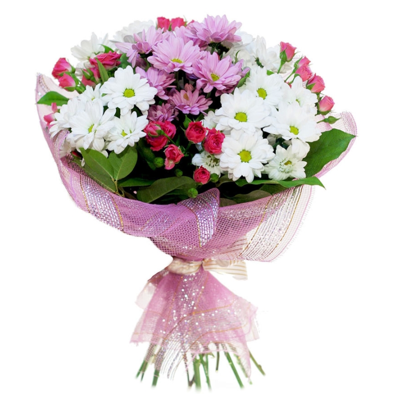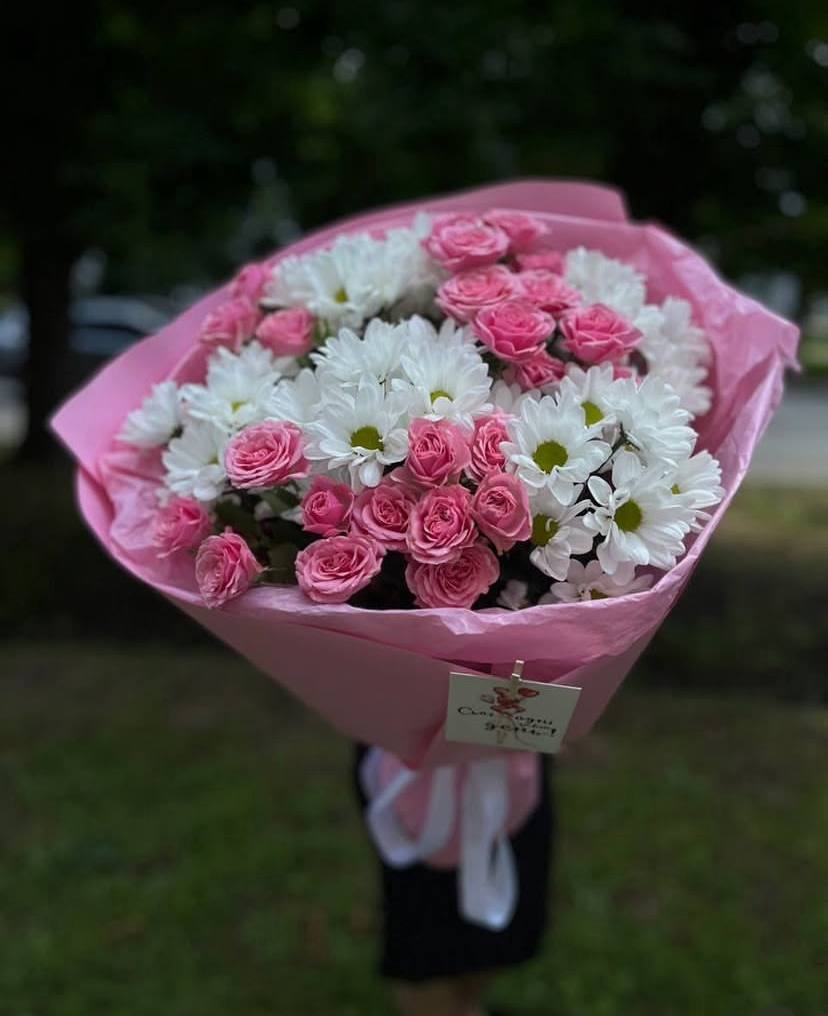 Головна / Квіти / Троянди / Кущові троянди / Ніжний мікс білих хризантем та рожевих кущових троянд