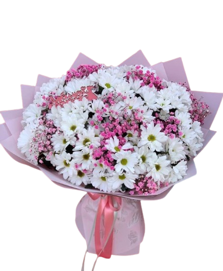 Головна / Квіти / Квіти / Хризантеми / Букет із 11 ромашкової хризантеми та гіпсофіли