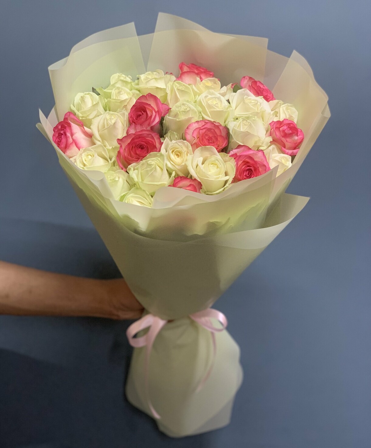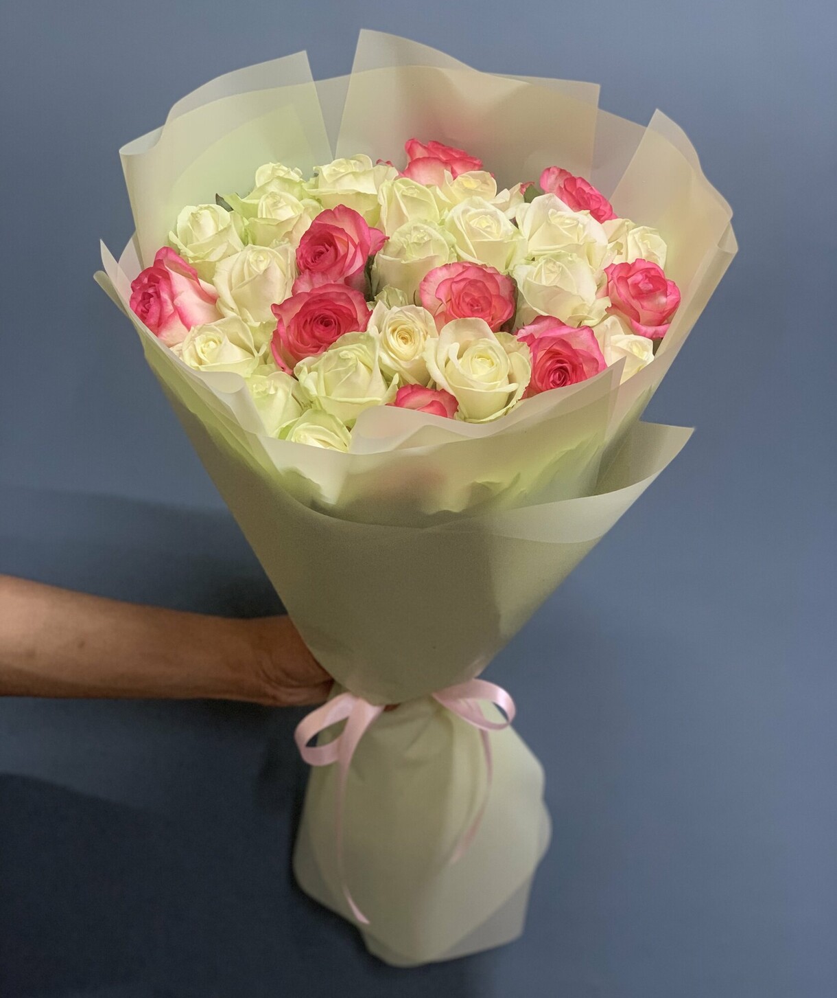 Головна / Квіти / Троянди / Білі троянди / Букет із 25 білих та рожевих троянд
