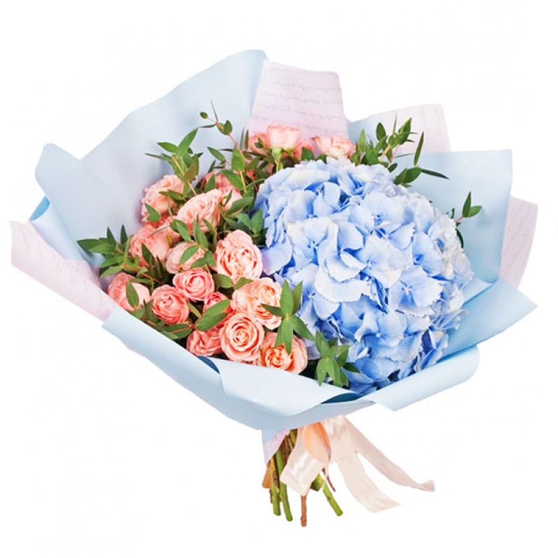 Головна / Квіти / Квіти / Гортензії / Букет із гортензії та рожевої кущової троянди