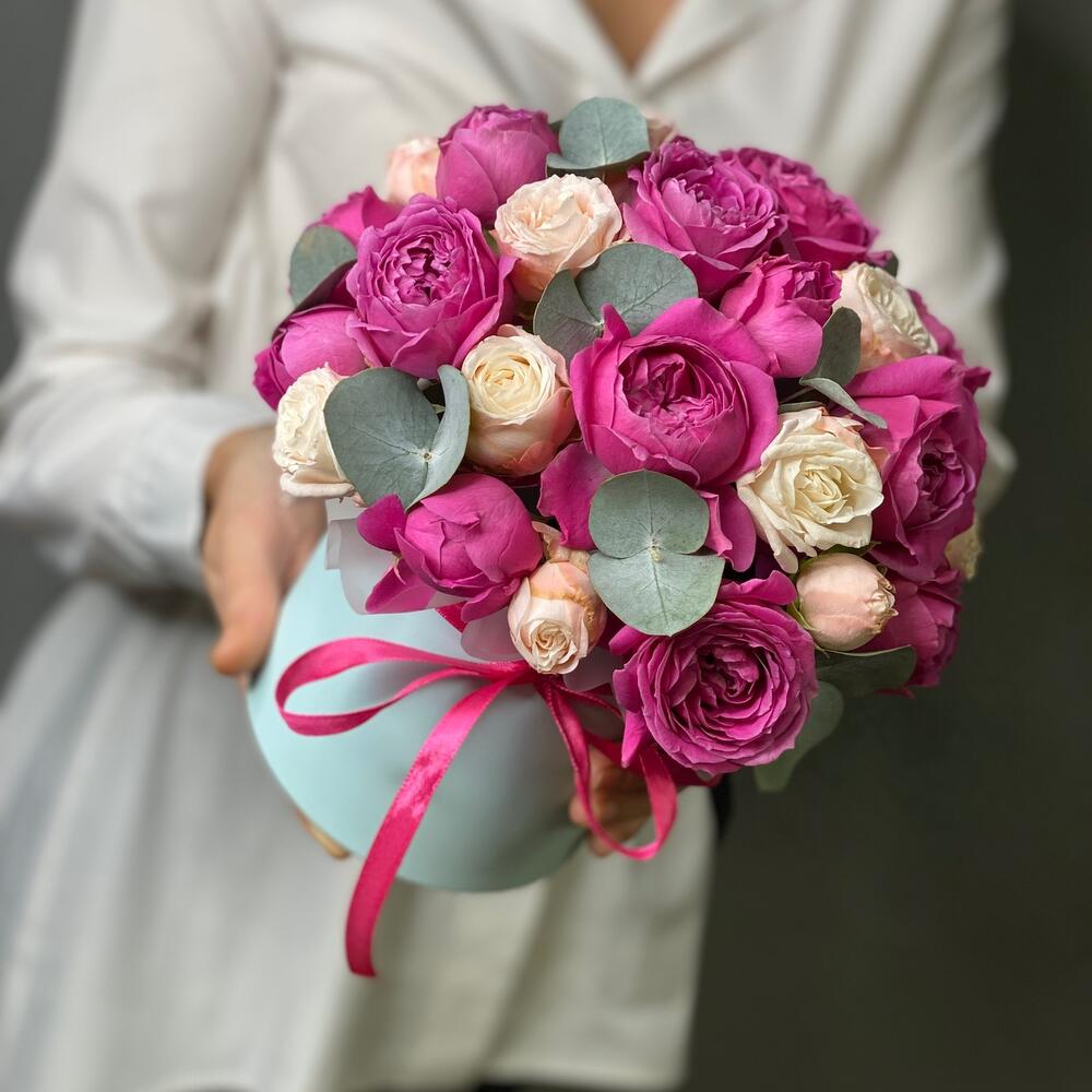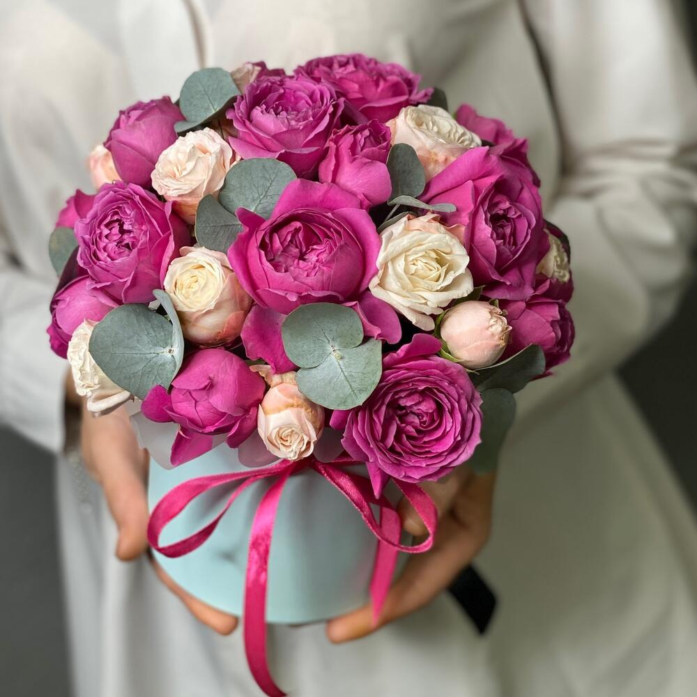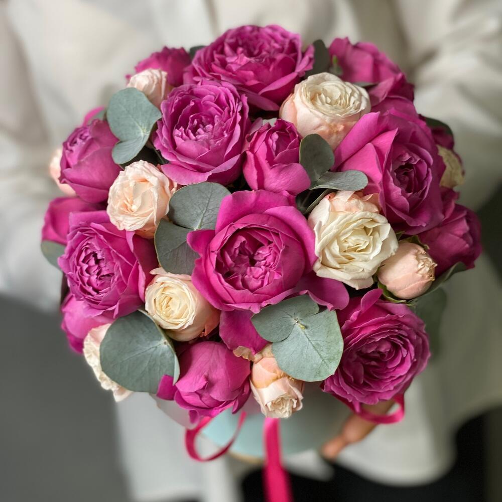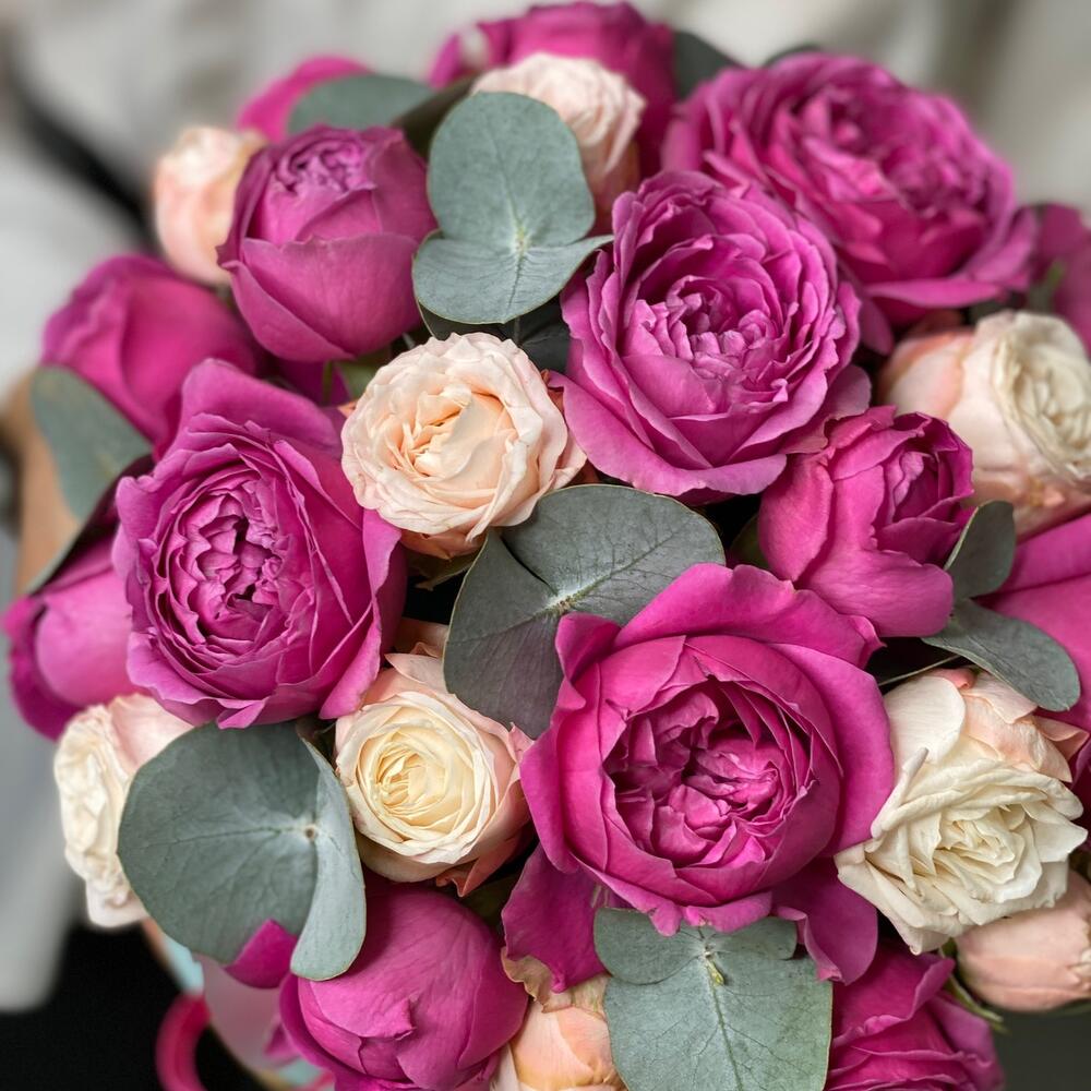 Головна / Квіти / Композиції / Квіти в коробці / Композиція в коробці із 9 півонієподібних кущових троянд