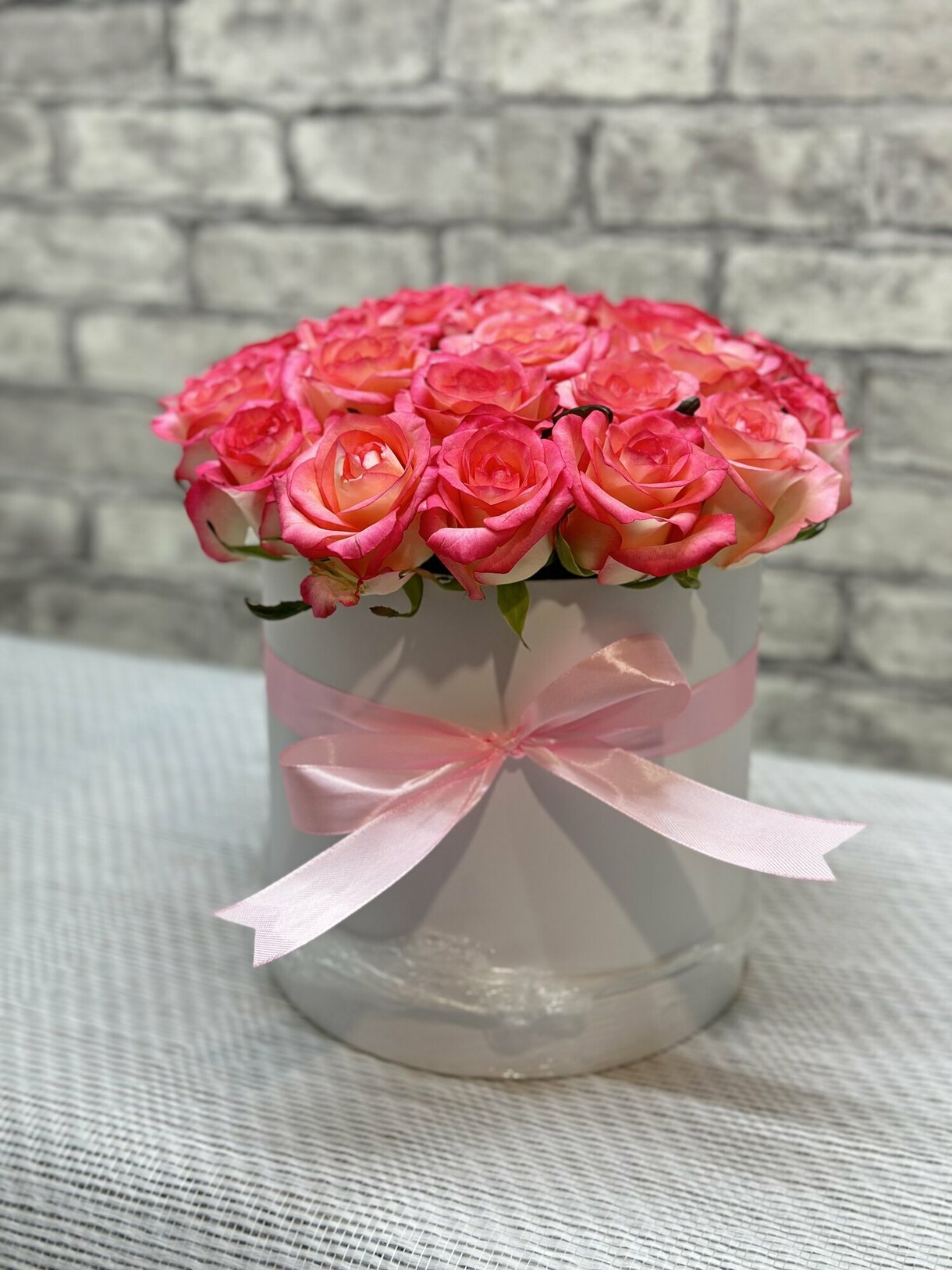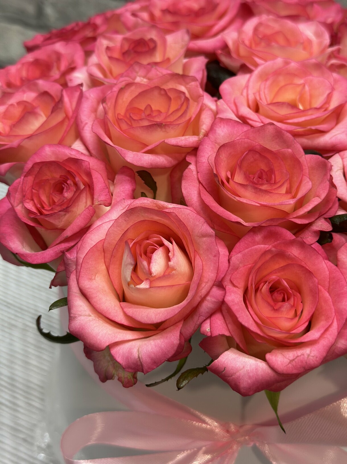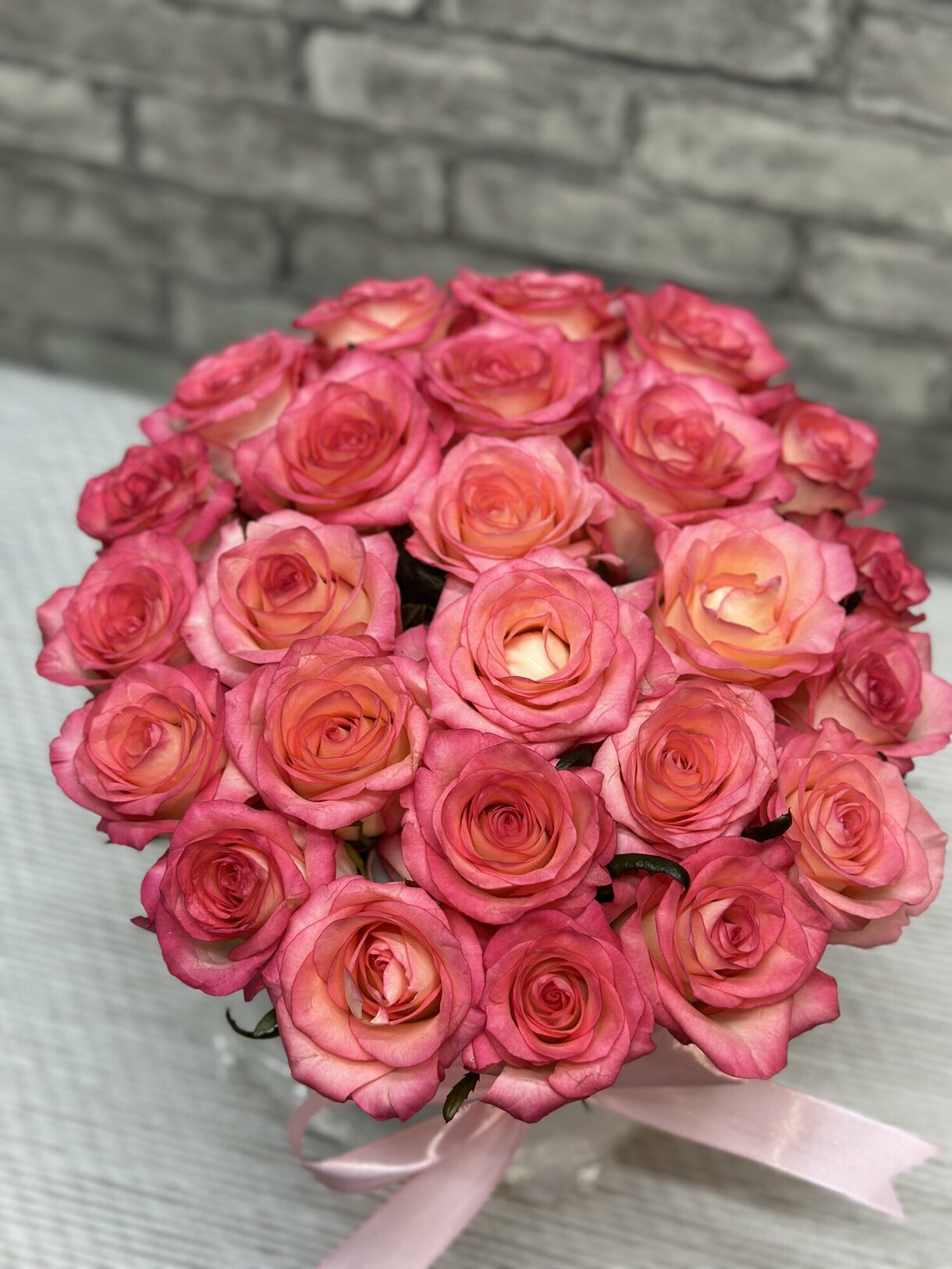 Головна / Квіти / Композиції / Квіти в коробці / Композиція із 25 рожевих троянд Джумілія в коробці