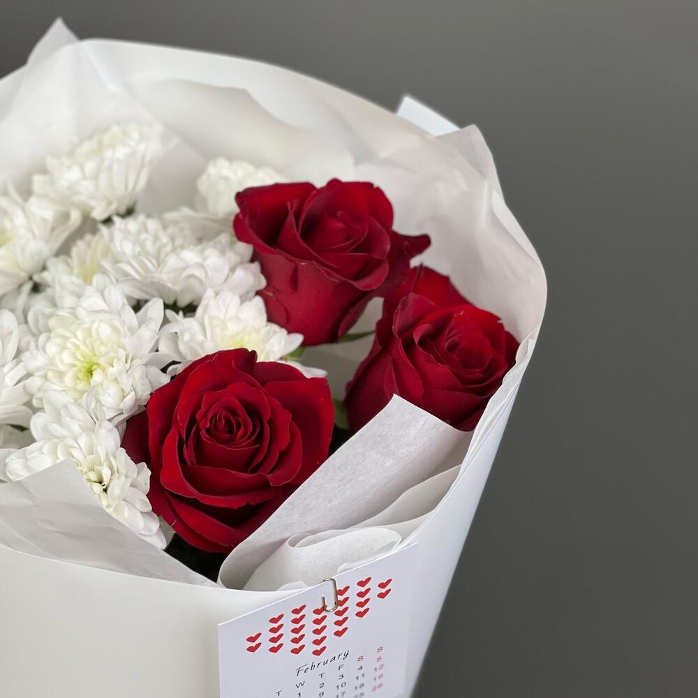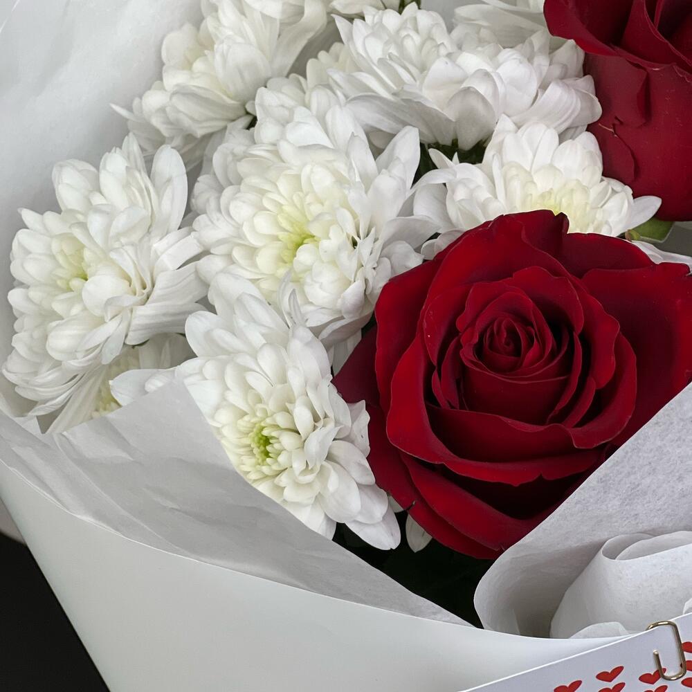 Головна / Квіти / Троянди / Червоні троянди / Букет із троянд і хризантеми «Теплий комплімент»