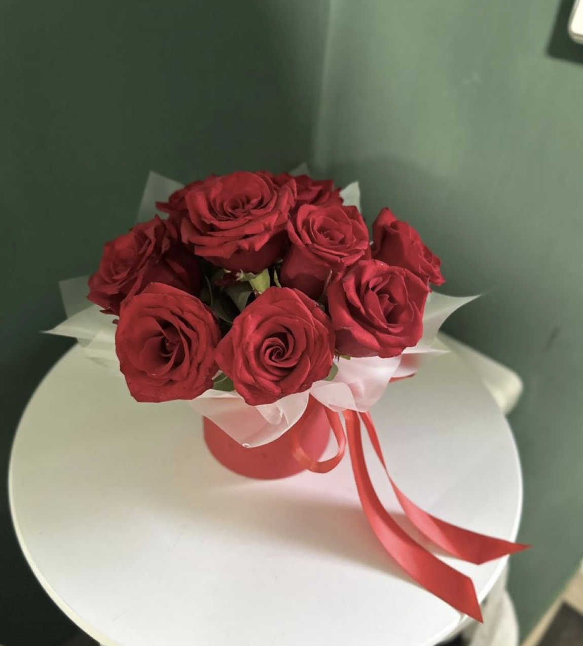 • Шляпна коробка  та атласна червона стрічка  + оазис