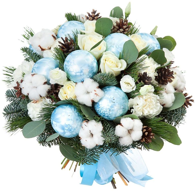 Головна / Квіти / Квіти / Святкові новорічні букети / Новорічний букет із білих троянд та бавовни