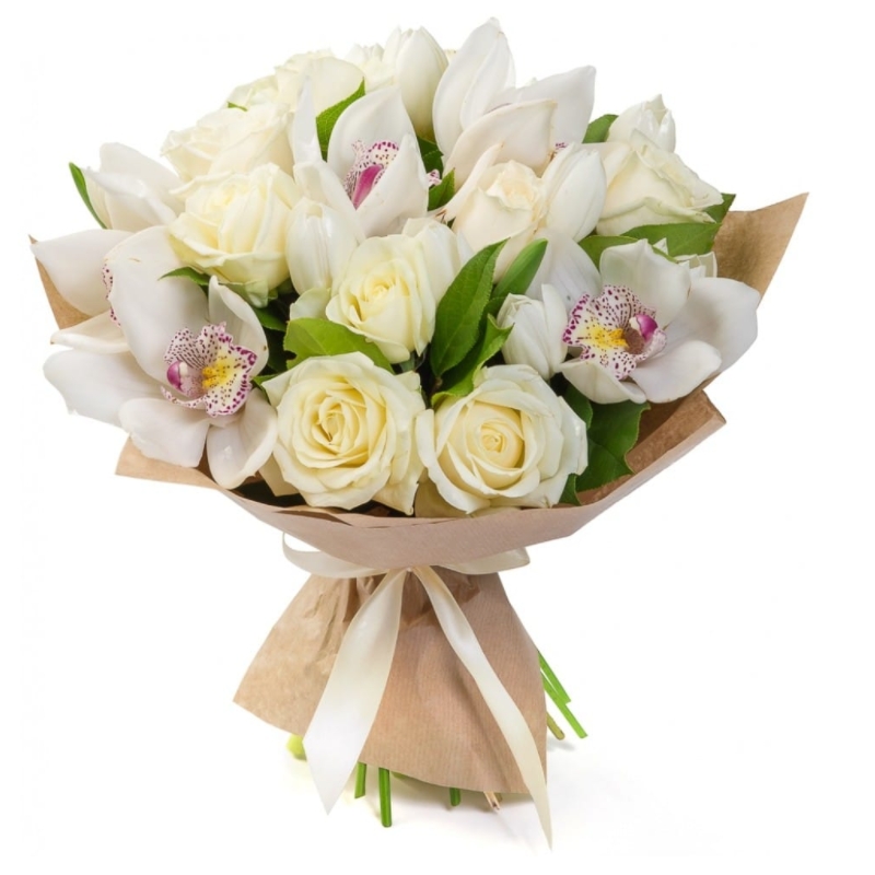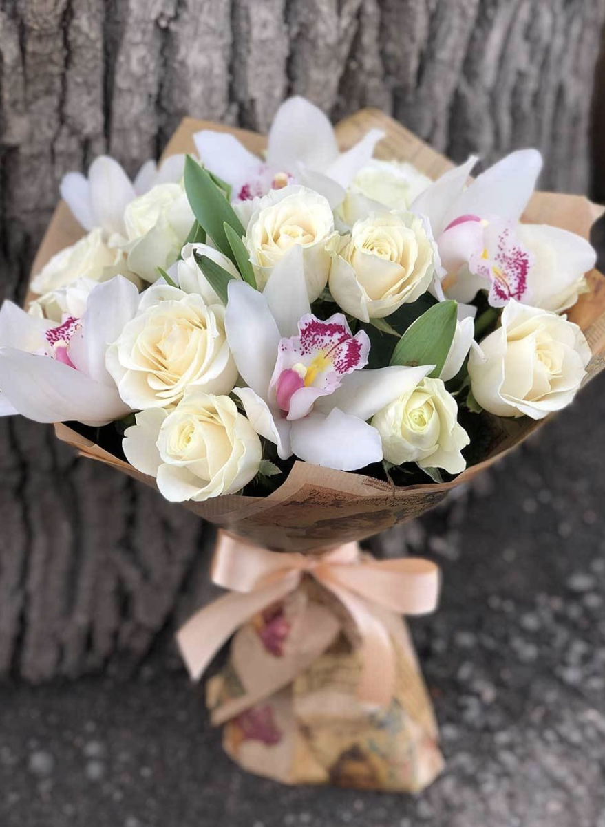 Головна / Квіти / Квіти / Орхідеї / Ніжний букет із білих троянд та орхідей