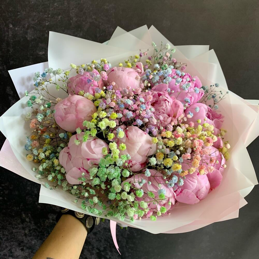 Головна / Квіти / Квіти / Півонії / Букет із 11 півоній та гіпсофіли