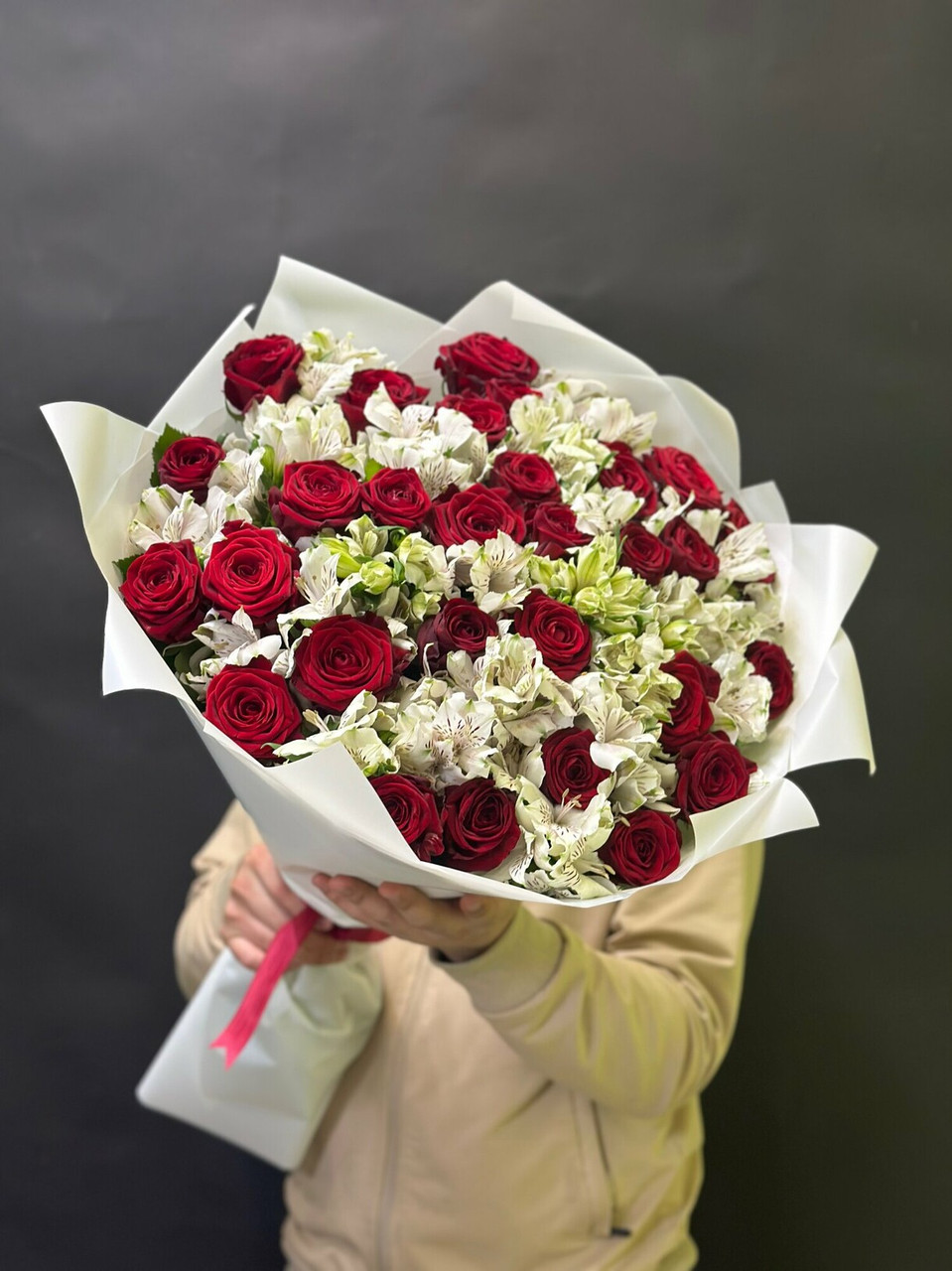 Букет із 25 червоних троянд в поєднанні з альстромерією