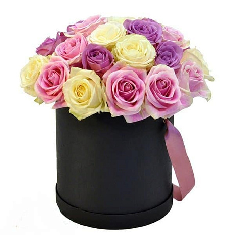 Головна / Квіти / Композиції / Квіти в коробці / 25 троянд у витонченій шляпній коробці