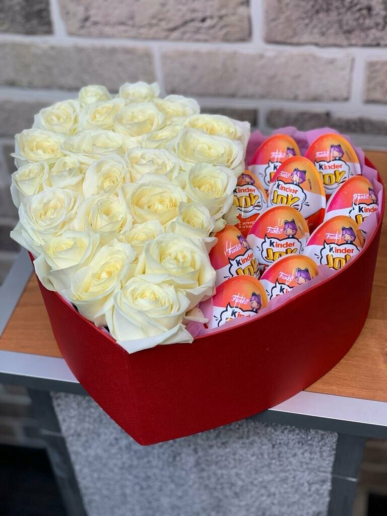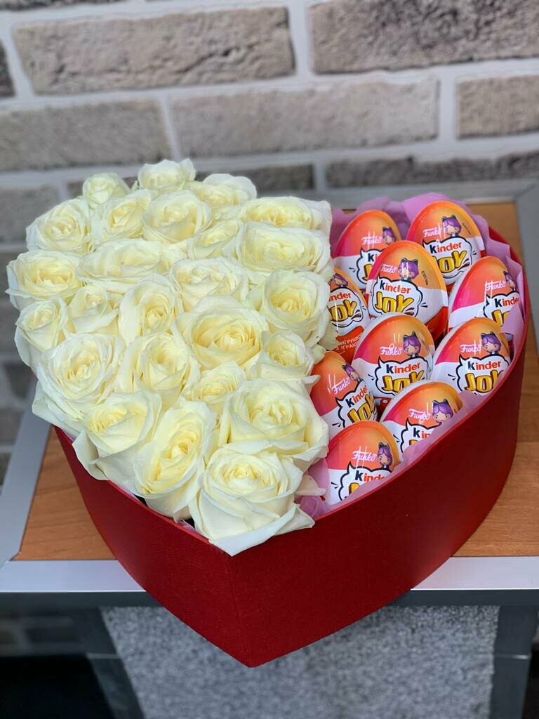 Головна / Квіти / Композиції / Квіти в коробці / Композиція сюрприз в серці із 25 білих троянд