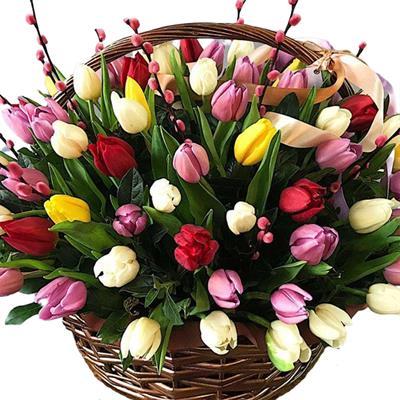 Головна / Квіти / Квіти / Тюльпани / Кошик із 75 різнокольорових тюльпанів