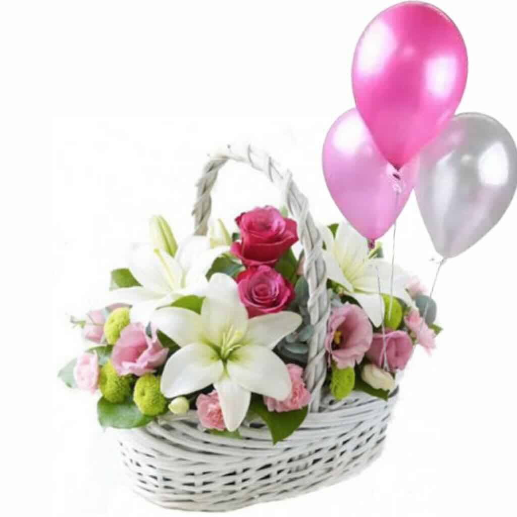 Головна / Квіти / Композиції / Квіти в кошику / Ароматний кошик лілій, троянд і ніжних еустом з гелевими кульками
