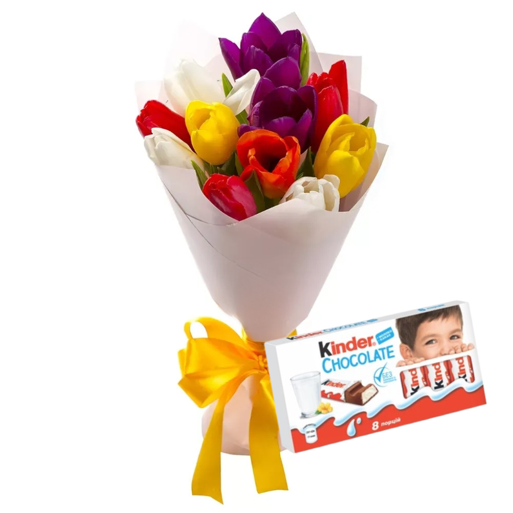 Головна / Квіти / Квіти / Тюльпани / Букет із 11 тюльпанів та кіндер шоколад