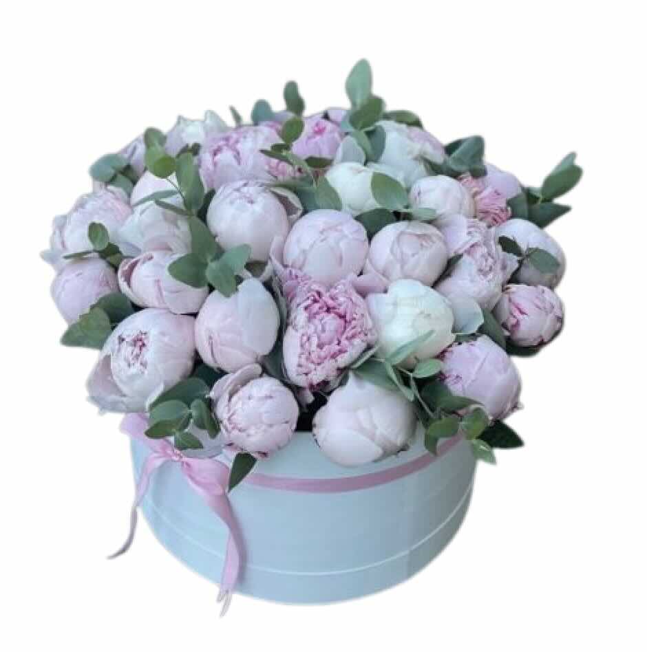 Композиція в коробці з 31 рожевої півонії та евкаліпту